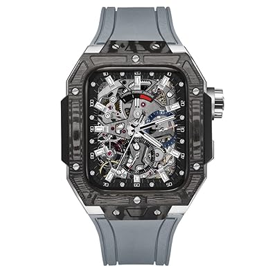 ケースには軽量かつ高耐久なカーボンファイバー素材を採用し、精密な研磨加工により美しい仕上がりを実現しています。ストラップには耐熱性・耐食性に優れたフッ素ゴムを使用しており、肌触りが良くアレルギーも起きにくい仕様です。
